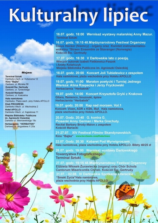 - Wernisaż malarstwa Anny Mazur (trwa do 24 lipca). Terminal Sztuki, ul. Kotwiczna 12. Darłówko Zachodnie. Wstęp wolny.