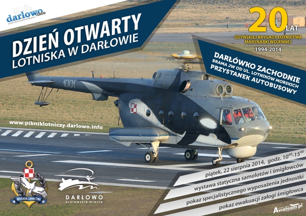 Dowódca 44. Bazy Lotnictwa Morskiego kmdr pil. Jarosław Andrychowski, Dowódca Grupy Lotniczej w Darłowie kmdr por. pil. Cezary Wiatrak oraz Burmistrz Darłowa Arkadiusz Klimowicz mają przyjemność zaprosić na Piknik Lotniczy, który odbędzie się już 22 sierpnia 2014 roku (godz. 10:00 – 15:00) na terenie lotniska Darłowskiej Grupy Lotniczej w Darłówku Zachodnim. Impreza ma charakter eventu rekreacyjnego z elementami pokazu statycznego samolotów, śmigłowców i pokazu specjalistycznego wyposażenia jednostki.