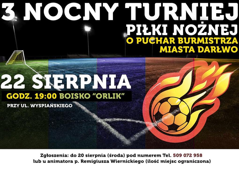 Już w najbliższy piątek (22 sierpnia) zapraszamy na trzecią edycję Nocnego Turnieju Piłki Nożnej o Puchar Burmistrza Miasta Darłowo. Rozgrywki odbędą się na "Orliku" przy ul. Wyspiańskiego. Start: 19:00. Drużyny 10 - osobowe można zgłaszać do 20 sierpnia pod numerem telefonu 509 072 958 lub bezpośrednio u animatora Remigiusza Wiernickiego. Zapraszamy !