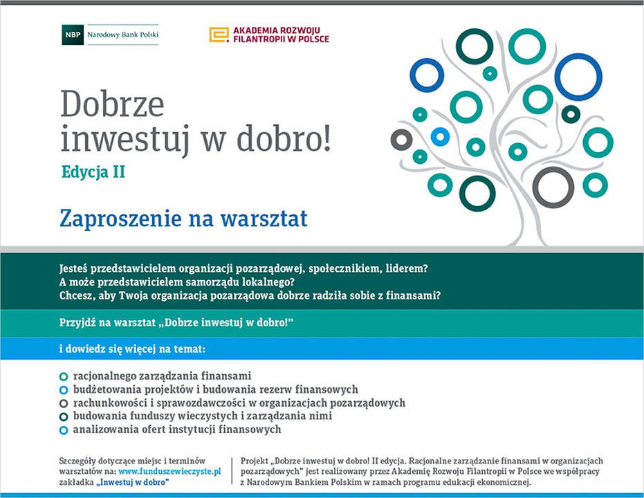 Projekt "Dobrze inwestuj w dobro! II edycja. Racjonalne zarządzanie finansami w organizacjach pozarządowych" jest realizowany przez Akademię Rozwoju Filantropii we współpracy z Narodowym Bankiem Polskim w ramach programu edukacji ekonomicznej.