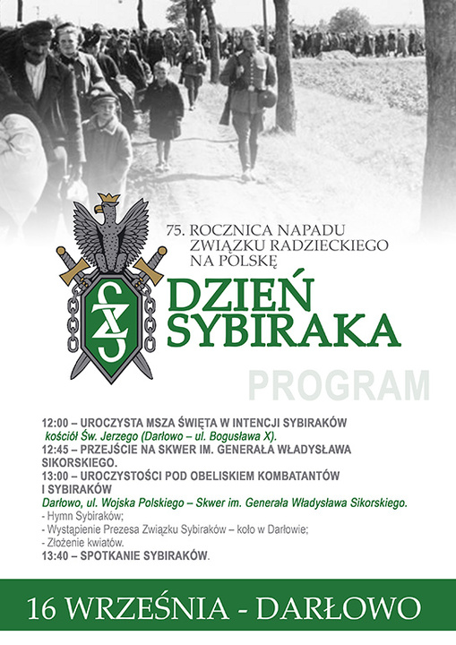 W przededniu 75. rocznicy napadu Związku Radzieckiego na Polskę - 16 września (wtorek) zapraszamy do udziału w uroczystych obchodach Święta Sybiraka w Darłowie.