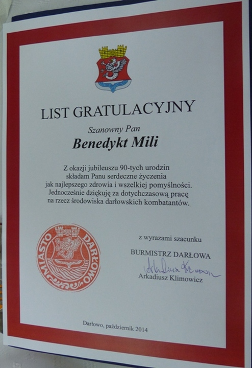 W sali Polskiego Komitetu Pomocy Społecznej w Darłowie 3 października 2014 obył się jubileusz dziewięćdziesięciolecia urodzin kombatanta RP porucznika  Benedykta Mili