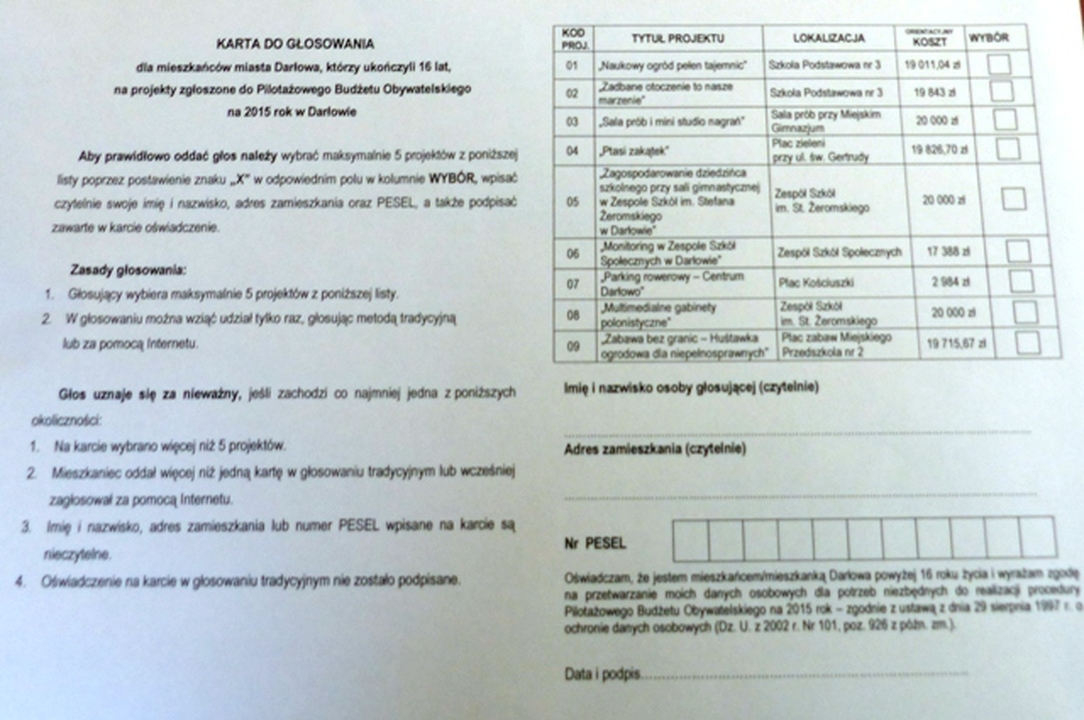 9.Zagospodarowanie dziedzińca szkolnego przy Sali gimnastycznej w Zespole Szkół im. Stefana Żeromskiego.                                                                                                  Głosować mogą wszyscy mieszkańcy Darłowa, którzy ukończyli 16 lat, biorąc pod uwagę datę roczną. Ważne jest miejsce zamieszkania, a nie miejsce zameldowania. Prawo do udziału w głosowaniu mają osoby zamieszkałe na terenie miasta Darłowa. Na karcie do głosowania należy podać imię, nazwisko, adres zamieszkania oraz nr PESEL. Karty do głosowania wypełnione niewłaściwie, niezawierające właściwych danych będą uznane za nieważne.  Głosować możemy w Internecie – na stronie internetowej: www.budzet.darlowo.pl poprzez wypełnienie interaktywnej karty do głosowania i przesłanie jej na adres email: kontakt@budzet.darlowo.pl lub głosując wykorzystując aktywny formularz na stronie. Głosując przez Internet nie trzeba drukować karty ani odwiedzać punktu głosowania, albo osobiście w punktach głosowania poprzez wypełnienie na miejscu karty do głosowania lub przekazanie wcześniej wypisanej karty: Urząd Miejski w Darłowie, Plac Tadeusza Kościuszki 9 - biuro podawcze lub w Zespole Szkół Społecznych im. Lotników Morskich STO. Można też głosować poprzez wysłanie karty do głosowania za pośrednictwem operatora pocztowego na adres: Biuro Podawcze Urzędu Miejskiego w Darłowie, 76-150 Darłowo, Plac Tadeusza Kościuszki 9 (decyduje data wpływu)                                                                                                       UWAGA: Na stronie www.budzet.darlowo.pl w zakładce „POBIERZ” znajduje się wzór karty do głosowania. W przypadku, kiedy nie można osobiście odwiedzić jednego z punktów głosowania – wydrukowaną i wypełnioną kartę do głosowania można przekazać osobie, która w naszym imieniu wrzuci kartę do urny ustawionej w punktach głosowania – w wyznaczonych miejscach i godzinach. Głosować można tylko jeden raz. Każde ponowne oddanie głosu spowoduje, że wszystkie głosy oddane przez daną osobę zostaną uznane za nieważne.  Wszystkie propozycje projektów, które przeszły pozytywnie weryfikację formalno-prawną są opublikowane na stronie internetowej budżetu obywatelskiego www.budzet.darlowo.pl – Baza projektów obywatelskich. Dodatkowo z listą projektów można zapoznać się w punktach głosowania. Aby prawidłowo oddać głos należy wybrać maksymalnie 5 projektów na karcie do głosowania poprzez postawienie znaku „X” w odpowiednim polu w kolumnie WYBÓR, wpisać czytelnie swoje imię i nazwisko, adres zamieszkania oraz PESEL, a także podpisać zawarte w karcie oświadczenie. Analogicznie oddajemy głos za pomocą Internetu, gdzie w karcie do głosowania mamy do uzupełnienia wyżej opisane pozycje. Głos będzie nieważny: gdy karta do głosowania będzie wypełniona niewłaściwie lub nie będzie zawierała wymaganych danych, gdy dane na karcie do głosowania zostaną wpisane niewyraźnie, gdy w wyniku weryfikacji karty zostanie stwierdzony brak podpisu lub dane osobowe lub numer PESEL będą niepoprawne, gdy w wyniku weryfikacji stwierdzone zostanie, że głos został oddany więcej niż jeden raz.