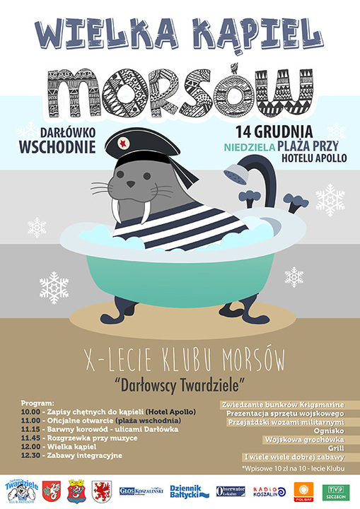 „Darłowscy Twardziele" Klub Morsów zaprasza wszystkich chętnych do wspólnego świętowania Jubileuszu 10-lecia Klubu. Z tej okazji 14 grudnia br. (tj. niedziela) odbędzie się wielka, wspólna kąpiel na plaży w Darłówku Wschodnim (tuż przy Hotelu Apollo). Poprzedzona ona zostanie o godzinie 11:00 oficjalnym otwarciem Urodzin Klubowych i barwnym korowodem, który przejdzie ulicami Kąpieliska (Darłówko Wschodnie i Zachodnie).