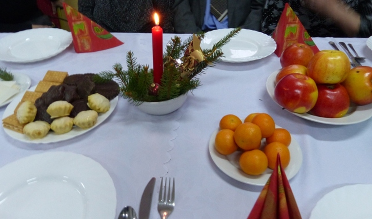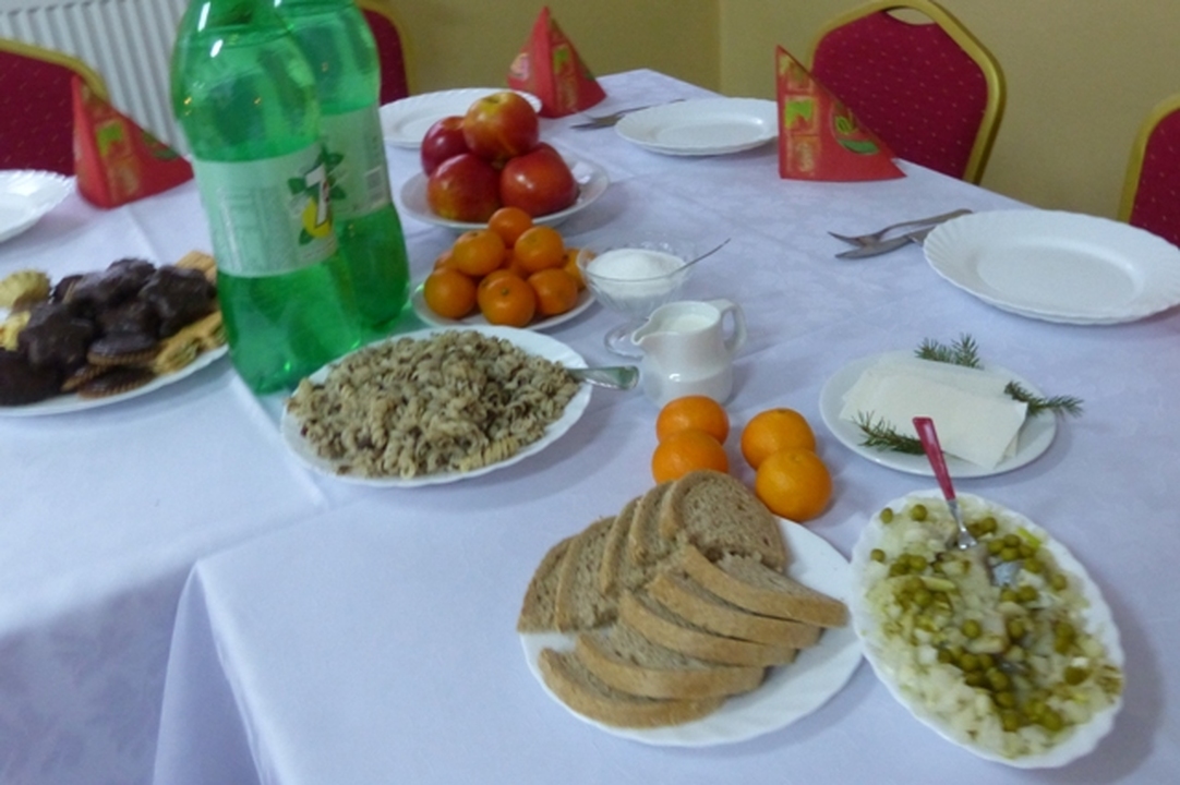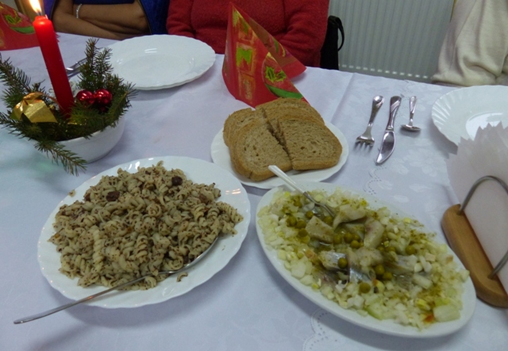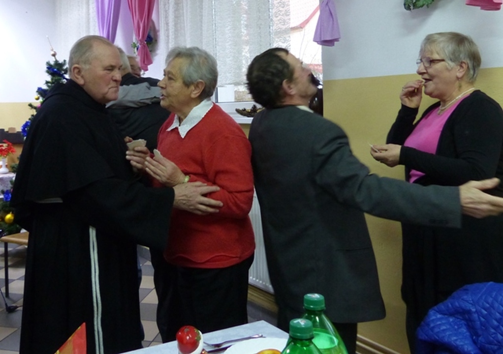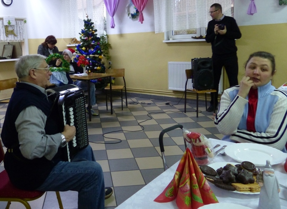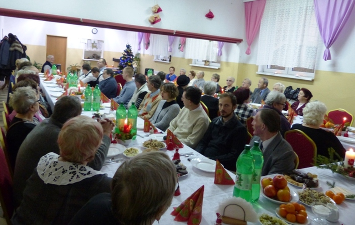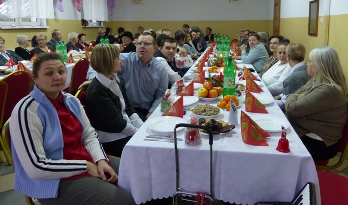 Przy wspólnym świątecznym stole zasiedli członkowie grupy wsparcia „Niezapominajka” i Stowarzyszenia Na Rzecz Osób Zagrożonych Wykluczeniem Społecznym o nazwie „Otwarte Drzwi”. Obie te działające przy MOPS-ie organizacje skupiają sporą część osób niepełnosprawnych oraz grupę seniorów z terenu miasta Darłowa i zajmują się rozwijaniem oraz propagowaniem postaw, inicjatyw i działań zmniejszających zagrożenie wykluczenia społecznego. W spotkaniu uczestniczyli: Arkadiusz Klimowicz – burmistrz Darłowa, wikariusz klasztoru Franciszkanów o Stefan Malandy, Waldemar Wieczorek - kierownik MOPS, Arkadiusz Sip – dyrektor DOK im. L. Tyrmanda, prezes stowarzyszenia „Otwarte Drzwi” Danuta Puczyńska. Spotkanie zainaugurował specjalnie przygotowany na tę okoliczność występ dzieci ze Świetlicy Środowiskowej „Bezpieczna Przystań” przygotowany pod kierunkiem Marioli Ozdoby i Moniki Lesner.  Grano, śpiewano kolędy i opowiadano o ludowych zwyczajach bożonarodzeniowych i noworocznych. Wystąpił także „człowiek orkiestra” – Jan Schwarzlose, który grając na akordeonie, śpiewając i dyrygując spowodował, że wszyscy śpiewali kolędy niczym w zgranym chórze. Łamano się opłatkiem i składano życzenia.  Specjalne życzenia nadziei na przyszłość złożył o. Stefan w imieniu proboszcza o. Stanisława Piankowskiego i całej Franciszkańskiej Wspólnoty. Arkadiusz Klimowicz wspomniał o wigilijnych oraz bożonarodzeniowych zwyczajach i tradycjach naszych przodków i złożył życzenia zdrowia, powodzenia i wiary w przyszłość wszystkim przybyłym i ich bliskim.  Przy świecach i zapachu świerkowych stroików spożywano pyszne potrawy wigilijne: pierogi z kapustą i grzybami, kluski z makiem i rodzynkami, kapustę z grochem, śledzie, czerwony barszczyk a także owoce i ciasta. Każdy z członków stowarzyszenia został obdarowany drobnym świątecznym upominkiem.