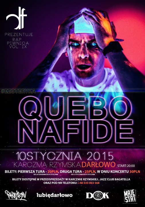 Już po raz dziewiąty spotkamy się w podziemiach lokalu Karczma Rzymska z prawdziwym hip-hopowym klimatem. Tym razem swoją obecnością oraz energicznym koncertem zaszczyci nas Quebonafide. "Quebo" doskonale znany m.in.  z takich utworów jak: "Euforia", czy "Hype" zaprezentuję swój premierowy album "Ezoteryka". Nie zabraknie również występów supportowych. Aktualnie na utworzonym wydarzeniu na facebooku jest rozpisany konkurs, gdzie możecie sami wybrać kogo byście chcieli usłyszeć przed gwiazdą wieczoru. Można również wygrać kilka biletów na to niezwykłe wydarzenie. Dołącz na: tnij.at/quebo. Zapraszamy ! 10 stycznia / Karczma Rzymska / Darłowo / Start:20:00. Bilety dostępne w przedsprzedaży w Karczmie Rzymskiej, Jazz Club Bagatela oraz pod numerem telefonu: +48 535 003 568