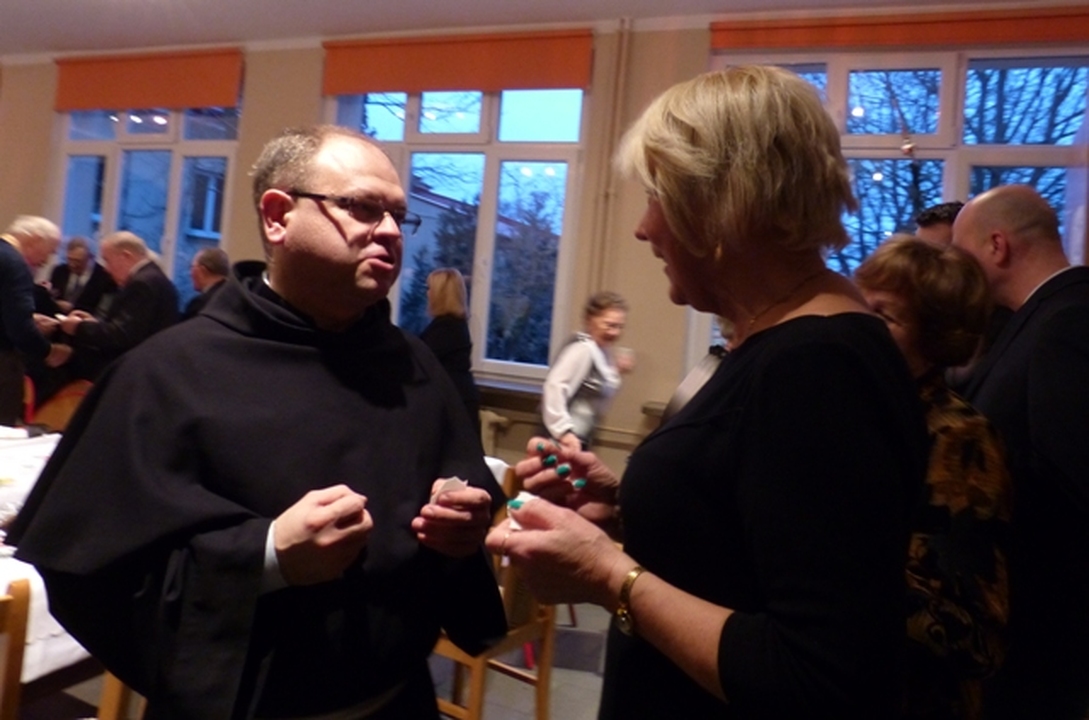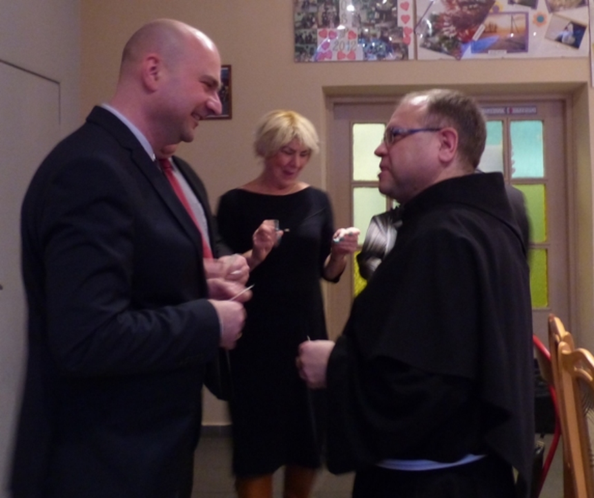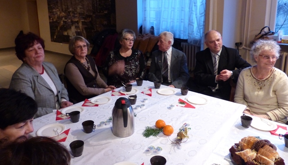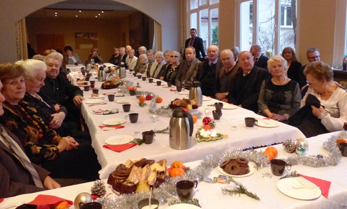 Swoją obecnością uroczystość zaszczycili: burmistrz Darłowa Arkadiusz Klimowicz, wójt gminy Darłowo Radosław Głażewski, przewodnicząca Rady Miejskiej Krystyna Sokolińska, proboszcz Parafii MB. Częstochowskiej Stanisław Piankowski, dyrektorzy placówek oświatowych i kulturalnych, szefowie organizacji pozarządowych zaprzyjaźnieni z pionierami oraz liczni członkowie Klubu Pionierów Ziemi Darłowskiej. Spotkanie opłatkowe zainaugurował występ zespołu muzycznego licealistów pod kierunkiem siostry Emanueli, który grał i śpiewał pastorałki. Na wstępie spotkania minutą ciszy uczczono zmarłych w minionym roku pionierów. Dalej wszystkich serdecznie powitała na opłatku prezes Klubu Pionierów Bożena Tomalak. Przy choince, kawie, herbacie, ciastach i owocach śpiewano kolędy, dzielono się opłatkiem i rozmawiano, co przyniesie nam Nowy Rok 2015. Burmistrz Darłowa, proboszcz kościoła Mariackiego i przewodnicząca Rady Miejskiej złożyli przybyłym życzenia zdrowia, radości, pomyślnego nowego roku i nadziei na lepsze jutro.