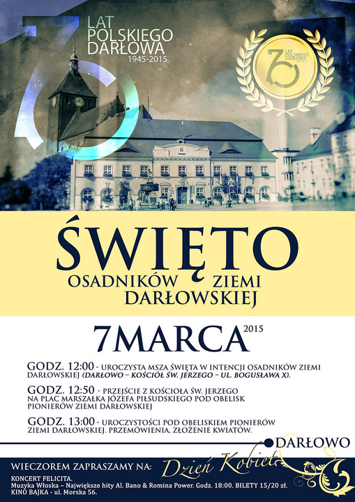 W rocznicę 70 Lat Polskiego Darłowa, w dniu 7 marca br., Burmistrz Darłowa oraz Klub Pionierów Ziemi Darłowskiej serdecznie zapraszają do udziału w obchodach Święta Osadników Ziemi Darłowskiej.