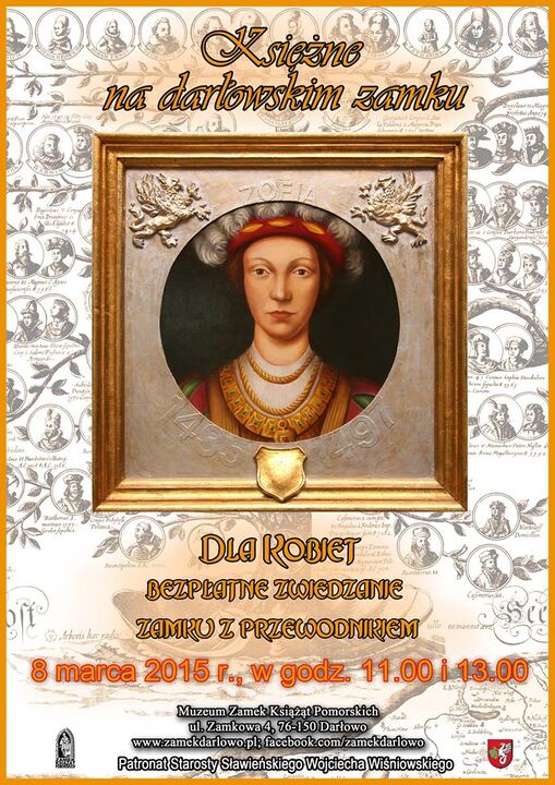 8 marca 2015 roku zapraszamy Panie do zamku na wydarzenie pn. „Księżne na darłowskim zamku". Tego dnia o godzinie 11.00 i 13.00 Panie będą mogły bezpłatnie zwiedzić komnaty z przewodnikiem. Zwiedzanie tematycznie związane będzie z historią życia księżnych mieszkających lub przebywających tymczasowo na zamku. Począwszy od Elżbiety Piastówny a kończąc na Elżbiecie Holsztyńskiej dowiemy się kim były, jakie miały pragnienia, pasje oraz w jaki sposób wpłynęły na rozbudowę i estetykę wnętrz zamkowych. Kto wie, Panie, może po zwiedzeniu zamku i poznaniu historii księżnych odkryjecie w sobie cechy księżniczki...?