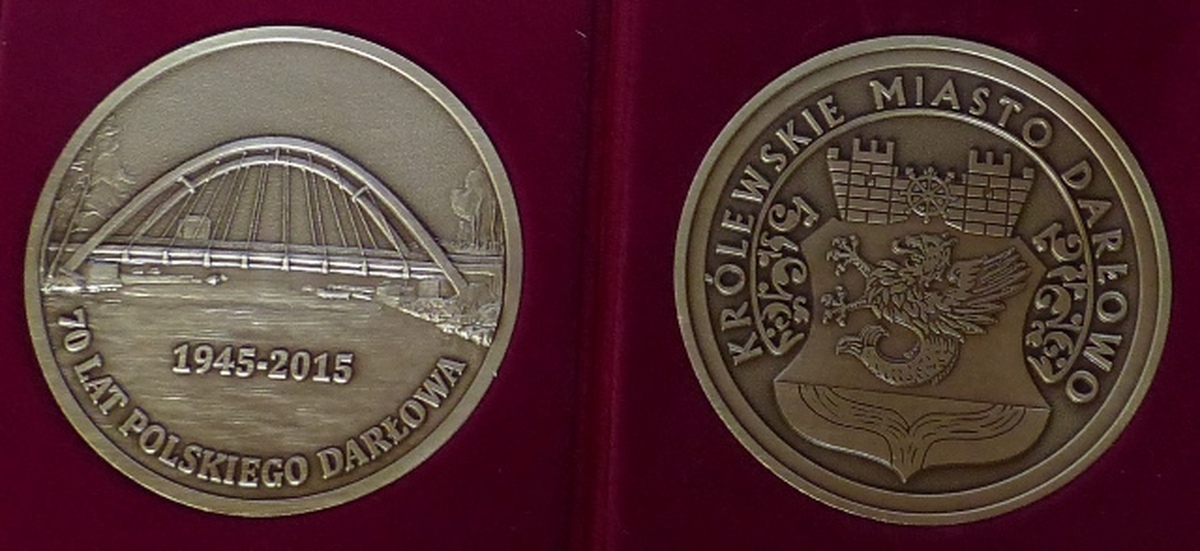 Okrągły medal z cynku pokryty galwanicznie stopem miedzi w kolorze złota na 70 Lat Polskiego Darłowa został wydany w limitowanym nakładzie 100 egzemplarzy. Na awersie znajduje się linowy most na rzece Wieprzy, który został oddany do użytkowania w 2014 roku.. Most jest symbolem powojennych dokonań i przemian oraz połączeniem przeszłości i teraźniejszości. Ponadto na awersie w półkolu widnieje napis 70 LAT POLSKIEGO DARŁOWA, a w nurcie rzeki lata 1945-2015. Na rewersie znajduje się herb miasta Darłowa i napis w ¾ okręgu „KRÓLEWSKIE MIASTO DARŁOWO”. Pomysłodawcą tematu przewodniego i inicjatorem wydania medalu jest Arkadiusz Klimowicz – burmistrz Darłowa. Projekt wstępny wyglądu medalu wykonała Magdalena Burduk – z Biura Promocji Miasta Darłowa. Medal odlano w Odlewni Kulej z Kłobucka, w nakładzie 100 sztuk. Medale o średnicy 70 mm i masie 102 g znajdują się w bordowym etui. Pierwsze medale wraz z certyfikatami zostały wręczone przez burmistrza miasta Darłowa na spotkaniu z członkami Klubu Pionierów Ziemi Darłowskiej 7 marca 2015 podczas obchodów Święta Osadników.