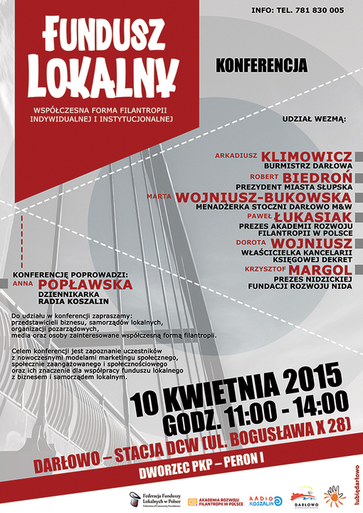 Darłowskie Centrum Wolontariatu oraz Miasto Darłowo zaprasza do udziału w Konferencji pn.: „Fundusz Lokalny - współczesna forma filantropii indywidualnej i instytucjonalnej", która odbędzie się już 10 kwietnia 2015 roku na Stacji DCW (Darłowo, ul. Bogusława X 28). Swój udział w konferencji potwierdzili paneliści: Arkadiusz Klimowicz: Burmistrz Darłowa, Robert Biedroń:Prezydent Miasta Słupska, Marta Wojniusz - Bukowska: menadżerka Stoczni Darłowo M&W, Paweł Łukasiak: Prezes Akademii Filantropii w Polsce, Dorota Wojniusz: Właścicielka kancelarii Księgowej DEKRET oraz Krzysztof Margol: Prezes Nidzickiej Fundacji Rozwoju NIDA. Panel dyskusyjny poprowadzi dziennikarka Radia Koszalin - Anna Popławska. Dyskusję z udziałem publiczności przewidziano w godzinach 11:00 - 14:00. Zapraszamy serdecznie.