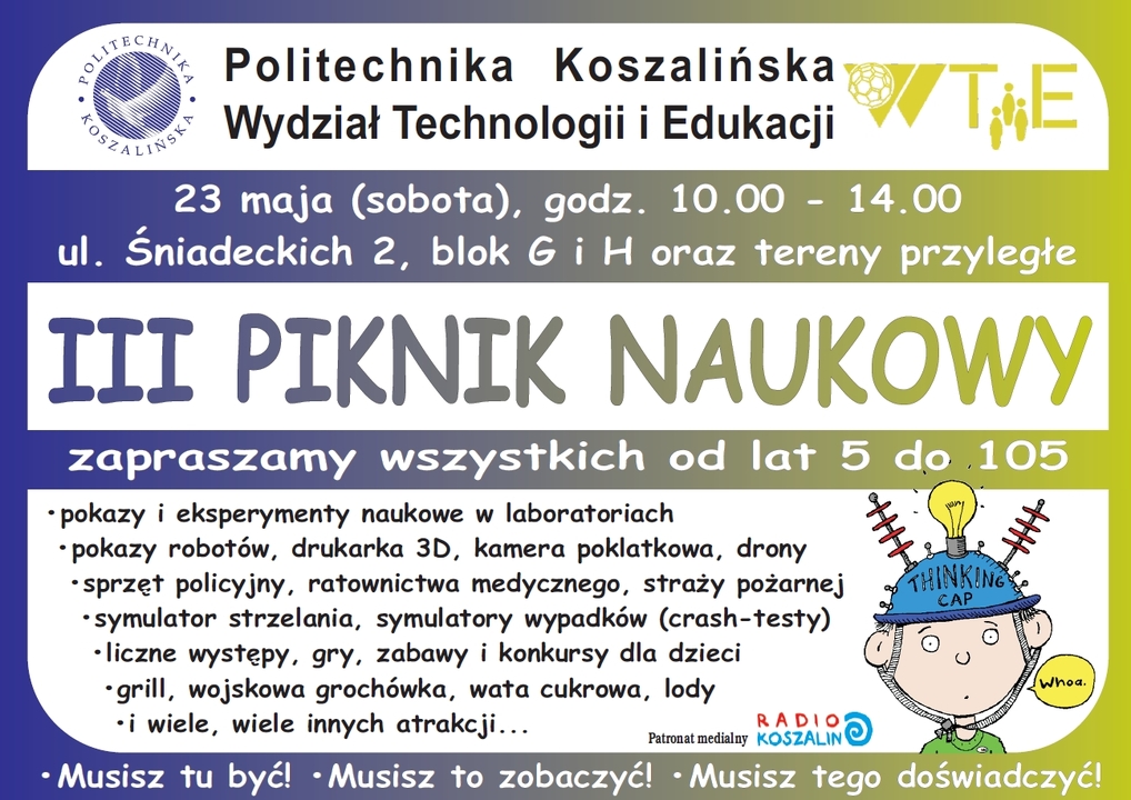 W dniu 23 maja, w godz. 10-14, w kampusie przy ul. Śniadeckich 2 Politechniki Koszalińskiej, w budynkach G i H oraz na terenach przyległych odbędzie się III Piknik Naukowy organizowany przez Wydział Technologii i Edukacji. Piknik adresowany jest do szerokiego kręgu mieszkańców Koszalina i okolic, organizatorzy zapraszają wszystkich bez względu na wiek. W programie zaplanowano liczne pokazy i eksperymenty naukowe w laboratoriach Wydziału, w których każdy będzie mógł wziąć aktywny udział. Można będzie m.in. dowiedzieć się jak są zbudowane i jak działają kolektory słoneczne, kamera termowizyjna i poklatkowa czy też drukarka 3D, zobaczyć pokaz robotów przemysłowych i mobilnych, inteligentnych systemów sterowania, a także latających dronów. Ponadto, przekonać się, że fizyka wcale nie musi być trudna i nudna, a dzięki chemii można wystrzelić nawet i z kurzej wątróbki…