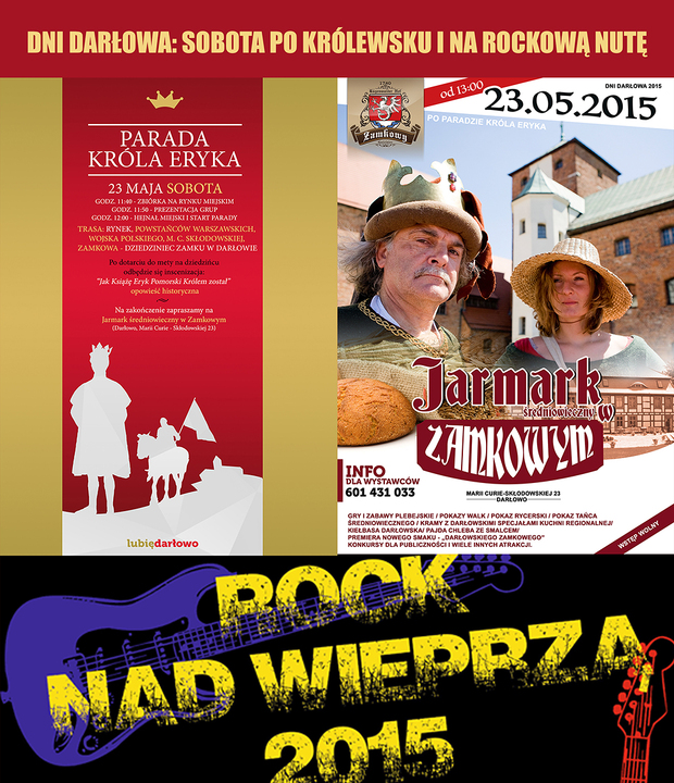 Dziś w samo południe zapraszamy do udziału w Paradzie Króla Eryka. Spotykamy się o 11:40 na placu przed Ratuszem. Po miejskim hejnale przejdziemy ulicami Darłowa by dotrzeć do Zamku, gdzie na dziedzińcu zamkowym Bractwo Rycerskie Ziemi Słupskiej zaprezentuje nam inscenizację historyczną pt.: „Jak książę Eryk Pomorski królem został”. Po niej przeniesiemy się do ogrodów nadwieprzańskich Zamkowego, gdzie do godzin popołudniowych potrwa jarmark średniowieczny. Przyjdźcie całymi rodzinami i bawcie się z nami podczas Dni Darłowa 2015.