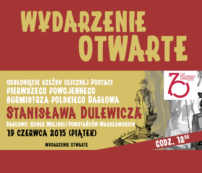 Arkadiusz Klimowicz Burmistrz Darłowa zaprasza na uroczystość odsłonięcia rzeźby ulicznej przedstawiającej postać pierwszego powojennego burmistrza polskiego Darłowa - Stanisława Dulewicza.