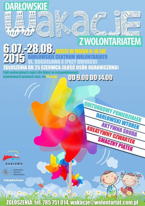Wielkimi krokami zbliżają letnie wakacje. To czas odpoczynku i zabawy, który warto przeznaczy na rozwijanie umiejętności i zainteresowań. Z różnych powodów dzieci w Darłowie pozostają w mieście na czas wakacji. I to właśnie do nich skierowany jest projekt „Darłowskie Wakacje z Wolontariatem” Jest to alternatywa dla komputera, nudy i samotności. Głównym celem spotkań  jest rozwój artystyczny dzieci, pobudzenie ich kreatywności oraz pokazanie szeregu możliwości na aktywne i przyjemne spędzenie wakacyjnego czasu. Zajęcia przeznaczone są dla dzieci w wieku od 6 do 10 lat i będą odbywały się w cyklach tygodniowych, w piętnastoosobowych grupach.