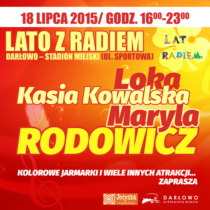 Już w najbliższą sobotę (18 lipca) w Darłowie odbędzie się koncert Lata z Radiem. Na muzycznej scenie wystąpią m.in. Loka, Kasia Kowalska i królowa polskiej piosenki - Maryla Rodowicz. Ponadto szereg atrakcji dla najmłodszych, plenerowe studio Polskiego Radia JEDYNKA, Polska Dziadek. Impreza odbędzie się na stadionie miejskim przy ul. Sportowej w godz. 16:00 - 23:00. Wstęp bezpłatny.
