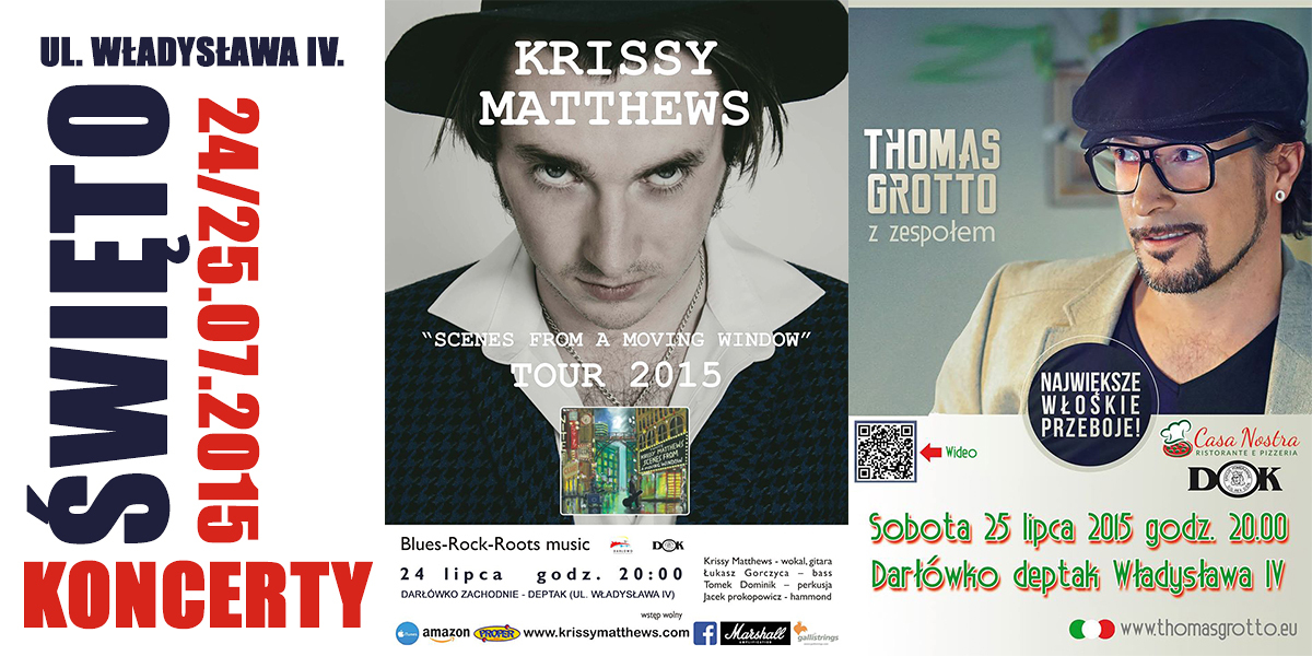 24 i 25 lipca br. (tj. piątek/sobota) w Darłówku Zachodnim, na ul. Władysława IV, która uznawana jest za deptak nadmorskiego Darłówka odbędą się dwa wydarzenia muzyczne. Pierwsze z nich rozpocznie się o godzinie 20:00 w dniu jutrzejszym (24 czerwca 2015). Na muzycznej scenie wystąpi Krissy Matthews. Dzień później, 25 lipca Darłowski Ośrodek Kultury i Pizzeria Casa Nostra zapraszają na włoskie hity w wykonaniu Thomasa Grotto wraz z zespołem. Koncert rozpocznie się o godzinie 20:00. Polecamy uwadze i zapraszamy do wspólnego świętowania.