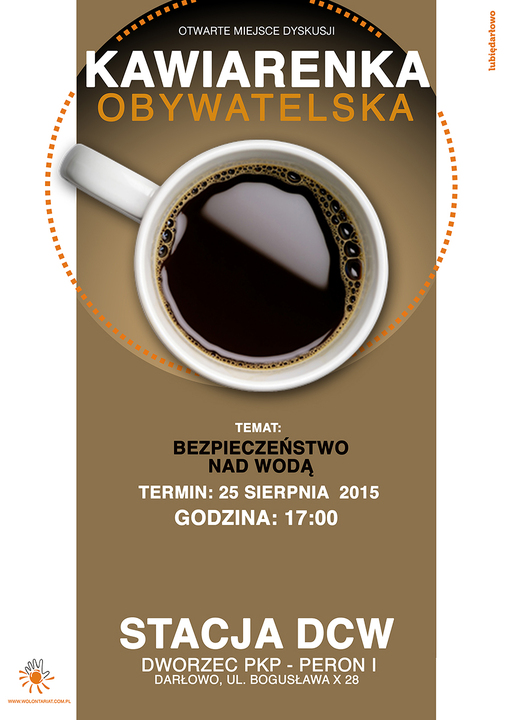 Darłowskie Centrum Wolontariatu, 25 sierpnia (wtorek) organizuję kolejną kawiarenkę obywatelską, do udziału w której zaprasza wszystkich zainteresowanych. Rozpocznie się ona o godz. 17:00 w siedzibie Darłowskiego Centrum Wolontariatu - Stacja DCW (PERON I) - ul. Bogusława X 28. Tym razem porozmawiamy o bezpieczeństwie nad wodą.