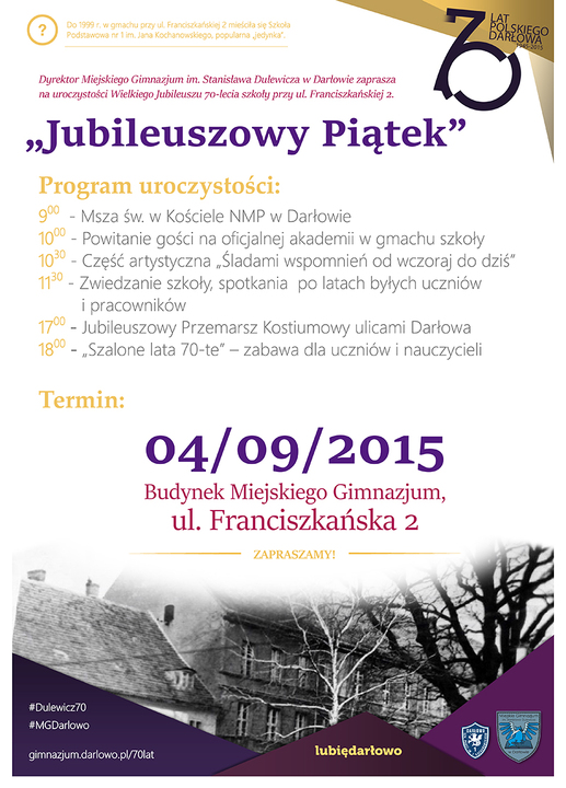 Przypominamy, że już w najbliższy piątek - tj. 4 września 2015 roku Miejskie Gimnazjum im. Stanisława Dulewicza (wcześniej im. Jana Kochanowskiego), uroczyście obchodzić będzie swój Jubileusz 70-lecia najstarszej szkoły królewskiego miasta nad Wieprzą. Z tej okazji Dyrekcja, Grono Pedagogiczne oraz Uczniowie przygotowali szereg atrakcji, na które zapraszamy wszystkich zainteresowanych - mieszkańców Darłowa, absolwentów szkoły, przyjaciół i gości. Obchody rozpoczną się Mszą Świętą w Kościele Mariackim (godz. 9:00). Następnie, jubileuszowa feta przeniesie się do gmachu szkoły gdzie odbędzie się: