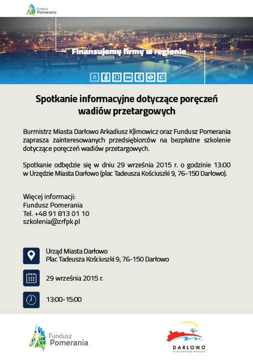Burmistrz Miasta Darłowo Arkadiusz Klimowicz oraz Fundusz Pomerania zaprasza zainteresowanych przedsiębiorców na bezpłatne szkolenie dotyczące poręczeń wadiów przetargowych.