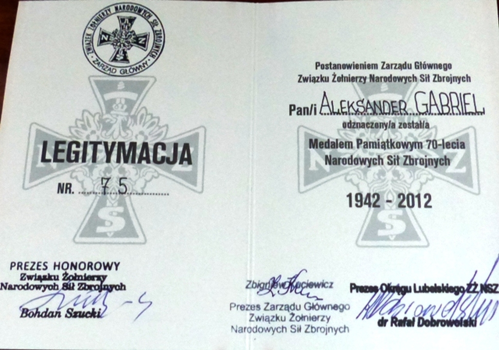 Aleksander Gabriel urodził się we wrześniu 1922 r. w Puchaczowie w powiecie łęczyńskim w woj. lubelskim. Puchaczów w roku 1527 otrzymał prawa miejskie od króla Zygmunta Starego. Prawa te odebrał w 1870 r. car za czynny udział mieszczan Powstaniu Styczniowym. Gabrielowie urodzili się w tej samej miejscowości w Puchaczowie tego samego dnia i miesiąca, ale żona jest młodsza od męża o 4 lata. Olek na miejscu chodził do szkoły i od małego interesował się młynarstwem. Stopniowo od ucznia, czeladnika i mistrza stał się młynarskim fachowcem. W czasie II wojny światowej Aleksander wstąpił do Partyzantki. W latach 1942-1945 był w Narodowych Siłach Zbrojnych, które walczyły z okupantem hitlerowskim i zwalczały komunistyczną partyzantkę. Pod pseudonimem Leszek Czarny razem z oddziałem pod komendą dowódcy pseudonim Jarząbek brał udział w wielu akcjach zbrojnych takich jak wysadzanie mostów kolejowych i transportów niemieckich jadących na wschód, rozmontowywanie torów kolejowych, czy w starciu zbrojnym z Niemcami pod Ostrówkiem. Razem z kolegą Edwardem Kołodziejem Aleksander ryzykując śmierć zdobył z magazynu niemieckiej żandarmerii w Lublinie lampowy aparat radiowy wysokiej klasy.  Przywieziono go konną furmanką jesienią 1942 r. pod węglem opałowym do Puchaczowa i przekazano pod ścisły nadzór zespołu redakcyjnego tajnego czasopisma „Szczerbiec", wydawanego na powielaczu. Radio używano do nasłuchów. W pozbawionym wówczas elektryczności Puchaczowie akumulatory do zasilania radia ładowano w młynie. Po wojnie był poszukiwany i ścigany przez UB, a żona Teodozja bita i prześladowana. Za radą znajomego Ukraińca, który był w UB uciekł w 1946 na zachód i pracował w Machowinie koło Ustki jako młynarz. Do Darłowa przeniósł się w roku 1949 i pracował jako kierownik zmianowy w darłowskim młynie. Gdy ten spłonął w roku 1964, jako jedyny został przeniesiony do młyna w Darłowie przy ul Kanałowej. Tam w wieku 62 lat doczekał emerytury. Aleksander Gabriel w swoim macierzystym kole Związku Kombatantów RP i BWP w Lublinie został awansowany w 2000 r. do stopnia podporucznika. Za udział w walkach z bronią w ręku był wielokrotnie wyróżniany i odznaczany. W 2012 roku otrzymał medal pamiątkowy 70 –lecia Narodowych Sił Zbrojnych 1942- 2012, a następie odznaczony Krzyżem Narodowego Czynu Zbrojnego powiedział nam syn Andrzej, który pracuje w Gdańsku.