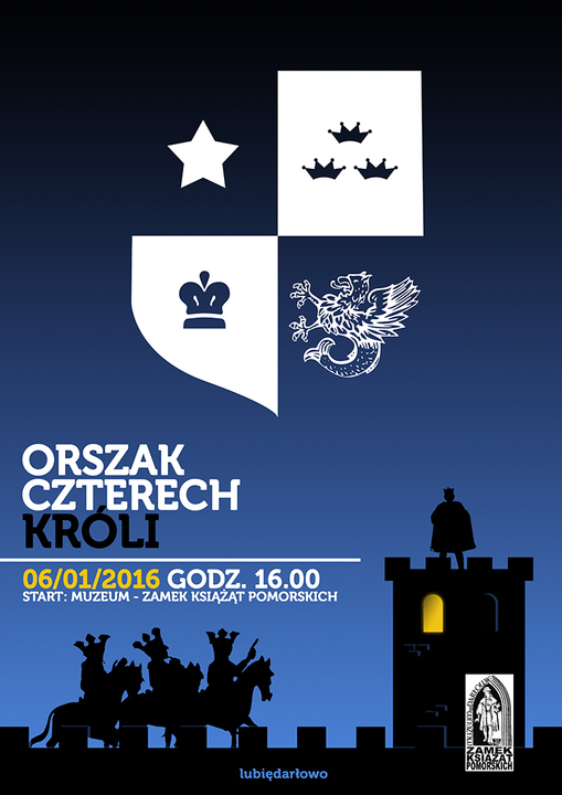 W związku ze zbliżającym się Świętem Objawienia Pańskiego, Miasto Darłowo w dniu 6 stycznia 2016 roku  (tj. środa) organizuje Orszak Czterech Króli. Rozpocznie się on o godzinie 16:00 na dziedzińcu Zamku Książąt Pomorskich - Muzeum w Darłowie (ul. Zamkowa 4).  Zapraszamy mieszkańców Darłowa, okolicy oraz wszystkich wypoczywających w mieście Króla Eryka do udziału w tym wydarzeniu oraz jego współtworzeniu. Mile widziane atrybuty królewskie: korony i berła, które przy odrobinie wyobraźni można w łatwy sposób wykonać we własnym zakresie. Jak na gród królewski przystało - pokażmy, że utożsamiamy się z naszą historią! Spotkajmy się 6 stycznia 2016 roku o godzinie 15:50 - na Zamku Króla Eryka! To tu, z trzech stron świata zejdą się orszaki - trzech biblijnych króli: Baltazara, Melchiora i Kacpra, gdzie w swojej rezydencji powita ich sam Eryk I Pomorski - czwarty, darłowski Król. W dalszą podróż Magowie udadzą się konno w asyście rycerzy z zaprzyjaźnionego Bractwa Rycerskiego Ziemi Słupskiej, by dotrzeć do tutejszego Kościoła Mariackiego, gdzie oddadzą pokłon narodzonemu Jezusowi Chrystusowi. Po złożeniu darów zapraszamy do wspólnego kolędowania i świętowania Święta Trzech Króli.
