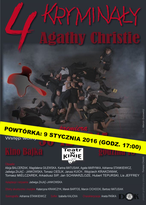 Niebanalne wydarzenie na zakończenie 2015 roku w DARŁOWIE jakim była premiera teatralna „4 Kryminałów Agathy Christie", owacje na stojąco i wypełniona po brzegi sala kina Bajka zmotywowały organizatorów do tzw. powtórki z rozrywki. Specjalnie dla publiczności, w dniu 9 stycznia 2016 roku darłowscy aktorzy wcielą się w swoje role by wystawić tą kryminalną sztukę raz jeszcze. Początek - godz. 17:00. Kino Bajka - ul. Morska 56. Ilość miejsc ograniczona - wstęp wolny.