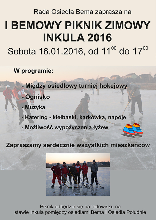 Rada Osiedla Bema zaprasza wszystkich mieszkańców na otwarty I Bemowy Piknik Zimowy - INKULA 2016. Odbędzie się on w sobotę, 16 stycznia br. w godzinach 11:00 -17:00. W programie: międzyosiedlowy turniej hokejowy, ognisko, muzyka, możliwość wypożyczenia łyżew oraz iście piknikowy catering czyli; kiełbaski, karkówka itd.
