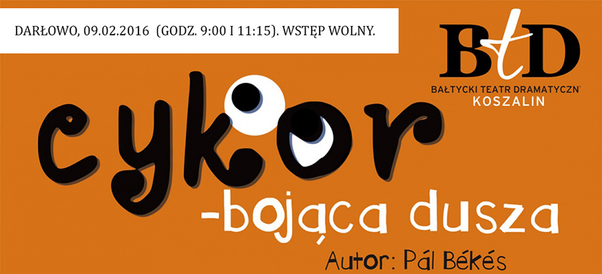 Dzieci 9 lutego br. - tj. środa, zapraszamy do kina Bajka na spektakl teatralny pt.: „Cykor" w wykonaniu aktorów Bałtyckiego Teatru Dramatycznego w Koszalinie. Spektakl zagrany zostanie o godzinie 9:00 i 11:15 w ramach Kulturalnych Ferii Zimowych - Darłowo 2016. Czas trwania 1.50 min (z przerwą). Wstęp wolny. Polecamy uwadze.
