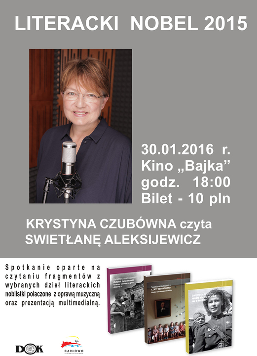 Darłowski Ośrodek Kultury ma przyjemność zaprosić na spotkanie oparte na czytaniu fragmentów z wybranych dzieł literackich noblistki Swietłany Aleksijewicz, połączone z oprawą muzyczną oraz prezentacją multimedialną. Odbędzie się ono 30 stycznia br. (tj. sobota) o godz. 18:00, w sali darłowskiego Kina Bajka. Bilety na to wydarzenie dostępne w miejscu imprezy w cenie 10 zł. Czyta - Krystyna Czubówna. Zapraszamy.
