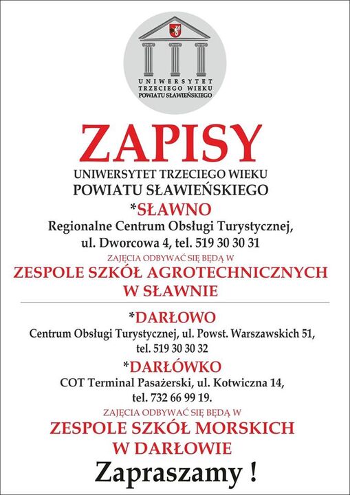 W Sławnie zapisało sie już ponad 70 słuchaczy, a w Darłowie ponad 20 osób. Dlatego do piątku 29 stycznia przedłużono nabór w Darłowie informuje nas organizator, jakim jest DARLOT. Aby ułatwić zapisy wystarczy wejść na stronę https://www.facebook.com/Uniwersytet-Trzeciego-Wieku-Powiatu-Sławienskiego napisać w wiadomości swój adres e-mail, na który zostanie przesłana deklaracja przystąpienia i niezbędne dokumenty. W pierwszym semestrze zostały przewidziane wykłady w czterech blokach tematycznych: Zdrowie, Region, Prawo oraz Pasje i Hobby.