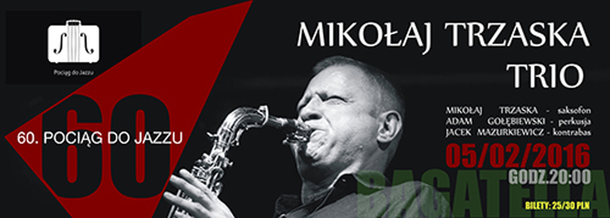 Fala Kultury (Marcin Cichocki) i Darłowski Ośrodek Kultury zapraszają - dziś: 5 lutego na koncert Mikołaja Trzaski TRIO. Odbędzie się on w ramach cyklicznej imprezy muzycznej organizowanej od lat w Darłowie pod nazwą Pociąg do Jazzu. Jazz Club Bagatella zagrają: Mikołaj Trzaska (saksofon), Adam Gołębiewski (perkusja) i Jacek Mazurkiewicz (kontrabas). Koncert rozpocznie się o godzinie 20:00. Polecamy uwadze. Bilety w cenie 25/30 zł.