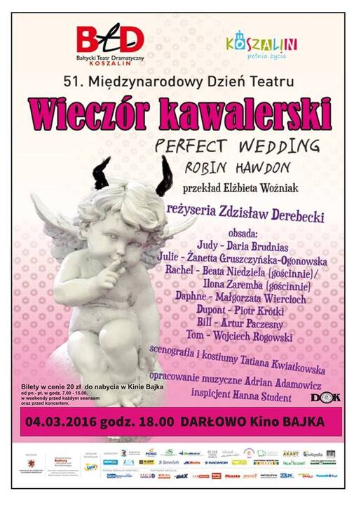 Darłowski Ośrodek Kultury im. Leopolda Tyrmanda zaprasza 4 marca (piątek) na godz. 18:00 do kina "Bajka", na spektakl teatralny pt.: „Wieczór kawalerski" w reż. Zdzisława Derebeckiego i udziałem aktorów Bałtyckiego Teatru Dramatycznego.