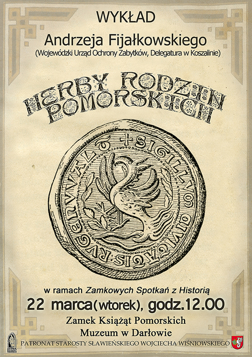 Zamek Książąt Pomorskich - Muzeum w Darłowie zaprasza na kolejne Zamkowe Spotkanie z Historią. Tym razem odbędzie się ono w najbliższy wtorek - tj. 22 marca 2016 roku, o godzinie 12:00 w siedzibie Króla Eryka - Zamku w Darłowie. Wykład Andrzeja Fijałkowskiego z Wojewódzkiego Urzędu Ochrony Zabytków, Delegatura w Koszalinie pt. „Herby rodzin pomorskich".