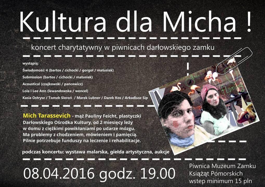 Darłowo zaprasza na wyjątkowy koncert charytatywny, który odbędzie się w piwnicach Zamku Książąt Pomorskich - Muzeum w Darłowie, 8 kwietnia 2016 roku. Całkowity dochód z tego wydarzenia zostanie przekazany na pomoc dla Mich'a Tarassevich'a, który zmaga się z ciężkimi powikłaniami po udarze mózgu.