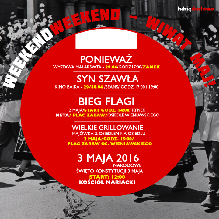 Wiwat maj, wiwat Darłowo, wiwat MAJÓWKA. W Darłowie nudzić się nie będziemy. Poniżej przedstawimy szczegółowy harmonogram atrakcji, do udziału w których zapraszamy Mieszkańców Darłowa i wszystkich naszych gości. Zachęcamy również do wywieszenia flag biało - czerwonych przy swoich posesjach. Radosnego świętowania! Udanego, dłuższego niż wszystkie weekendu majowego - zwanego Majówką.