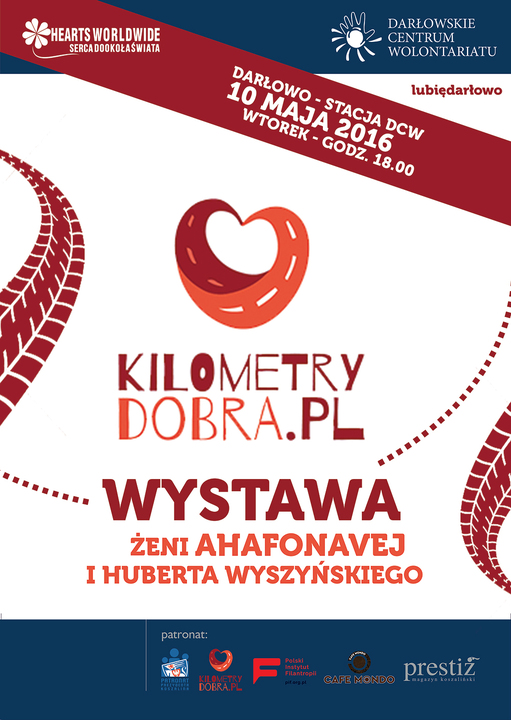 Darłowskie Centrum Wolontariatu w ramach akcji charytatywnej pn. Kilometry Dobra, zaprasza 10 maja 2016 roku do swojej siedzimy na wystawę podopiecznych Fundacji Hearts World Wide czyli Serca Dookoła Świata. Tym razem poznamy Żenię Ahafonavą i Huberta Wyszyńskiego.