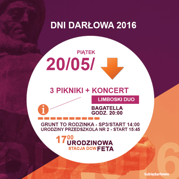 Dziś piątek, 20 maja. Przed nami trzy pikniki i koncert: LIMBOSKI DUO. Za oknem piękna pogoda. Życzymy miłego dnia i zapraszamy do wspólnego świętowania 704 Urodzin Darłowa.