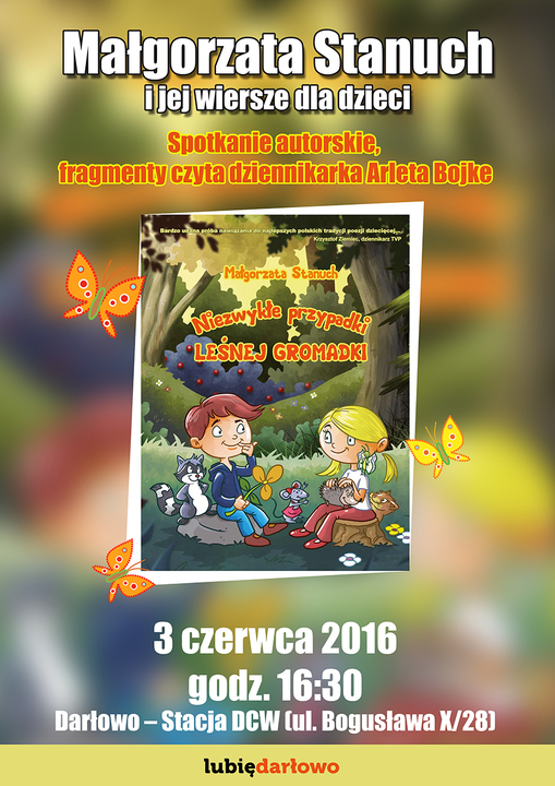 Biuro Promocji Miasta i Komunikacji Społecznej wraz z Darłowskim Centrum Wolontariatu zapraszają na spotkanie z autorką wierszy dla dzieci - Małgorzatą Stanuch. O „Niezwykłych przypadkach leśnej gromadki" - książce, zbiorze wierszy które z humorem przekazują życiowe mądrości zarówno dzieciom jak i dorosłym a także o tym, że czytanie to świetna zabawa porozmawiamy z jej autorką. Fragmenty wierszy czytać będzie, pochodząca z Darłowa - dziennikarka Telewizji Polskiej Arleta Bojke. Spotkanie odbędzie się w siedzibie Darłowskiego Centrum Wolontariatu, 3 czerwca 2016 roku (tj. piątek), o godz. 16:30.