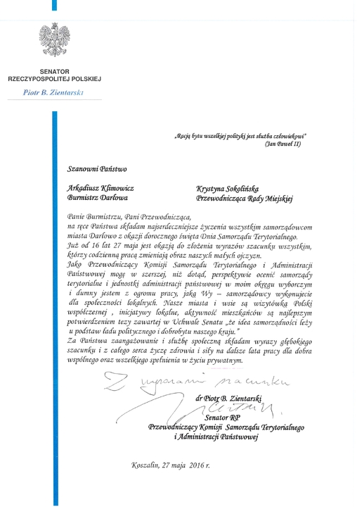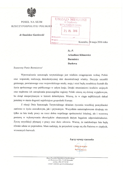 Z tej okazji na ręce Burmistrza Darłowa - Arkadiusza Klimowicza i Przewodniczącej Rady Miejskiej - Krystyny Sokolińskiej, do darłowskiego ratusza wpłynęły listy gratulacyjne z życzeniami, od parlamentarzystów: posła Stanisława Gawłowskiego (PO) i senatora Piotra Zientarskiego (PO).