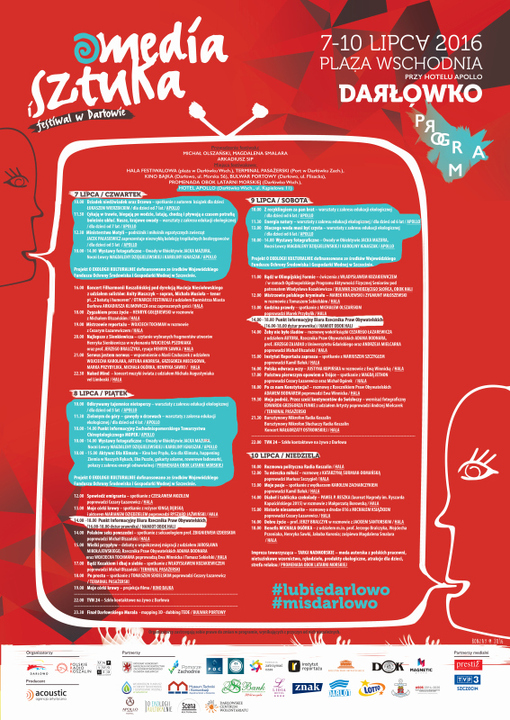 Zapraszamy na 6.edycję festiwalu Media i Sztuka, który w tym roku odbędzie się w dniach 7 - 10 lipca 2016 roku. Cztery dni ciekawych spotkań twarzą w twarz, możliwość zadania pytań i usłyszenia osobistych odpowiedzi. Ponad 40 wydarzeń, blisko 40 gości, imprezy towarzyszące - to wszystko już od czwartku w Darłowie - Darłówku: duecie idealnym do wypoczywania.
