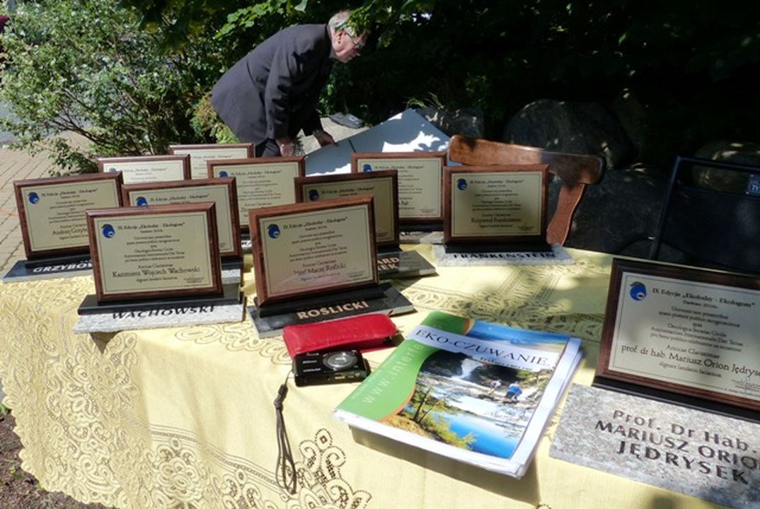Przybyłych ekologów powitała Jadwiga Gosiewska –od roku 1987 prezes Ekologicznego Komitetu Obywatelskiego „Czuwanie”, lekarz pediatra i długoletni społecznik. Jadwiga Gosiewska przypomniała historię i działalność stowarzyszenia. EKO - Czuwanie powstało, jako wyraz protestu przeciwko budowie elektrowni atomowej w wykonaniu sowieckim nad jeziorem Kopań koło Darłowa, wkrótce po wybuchu elektrowni w Czarnobylu. Klub skutecznie protestował przeciwko budowie E.J. w Polsce poprzez demonstracje uliczne, wiece, spotkania naukowców ze społeczeństwem, gościł i dawał opiekę lekarską oraz udzielał pomocy dzieciom z Czarnobyla. Na uroczystość przybyli m.in.: prof. dr hab. Mariusz- Orion Jędrysek sekretarz stanu w Ministerstwie Środowiska i Główny Geolog Kraju oraz Pełnomocnik Rządu ds. polityki surowcowej, Starosta Powiatu Sławieńskiego Wojciech Wiśniowski, Burmistrz Darłowa Arkadiusz Klimowicz, Burmistrz Sławna Krzysztof Frankenstein. Spotkanie rozpoczęto krótką modlitwą za zmarłych ekologów, którą poprowadził ks. prałat Jan Giratowicz ze Słupska obchodzący 50-lecie kapłaństwa. Kapituła wyróżnienia po przeanalizowaniu zasług położonych dla ochrony środowiska i ekologii wyróżniła następujące osoby: ks. Zbigniew Krawczyk, mgr Ryszard Bruderek, Roman Strzałkowski, Eugeniusz Berliński, dr Krzysztof Frankenstein, Stowarzyszenie na rzecz Mieszkańców Gminy Darłowo, Lidia Bąk, Andrzej Grzybowski, Kazimierz Wojciech Wachowski, prof. dr hab. Mariusz – Orion Jędrysek, Jozef Maciej Roślicki, Wojciech Romaniszyn. Każdorazowo po odczytaniu przez wnioskującego zasług położonych dla ekologii wręczano osobie wyróżnionej marmurową tabliczkę z jego nazwiskiem, którą następnie mocowano na Skale Ekologa. Należy podkreślić, że dwóch spośród wyróżnionych: Berliński Eugeniusz i Strzałkowski Roman są członkami Towarzystwa Przyjaciół Ziemi Darłowskiej, którego również członkiem zbiorowym jest EKOCZUWANIE. Należy podkreślić zasługi dla ekologii, co prawda młodego, ale prężnego Stowarzyszenia na rzecz Mieszkańców Gminy Darłowo. Powstało ono w odpowiedzi na brak zrozumienia potrzeb mieszkańców przez ówczesne władze Gminy Darłowo. W ostatnich latach na obszarze gminy Darłowo postawiono 116 siłowni wiatrowych. Część z nich postawiono bezprawnie w miejscach, których oddziaływają one szkodliwie na mieszkańców i przyrodę. Potwierdził to proces sądowy, jaki w imieniu Stowarzyszenia na rzecz Mieszkańców Gminy Darłowo wytoczyła i wygrała jego prezes Grażyna Marcinkowska Hryckiewicz. Pani prezes, jak mówiła nie jest przeciwnikiem siłowni wiatrowych, lecz stawiania ich w pobliżu zabudowań, czy korytarzy przelotów ptaków chronionych przez Naturę 2000.