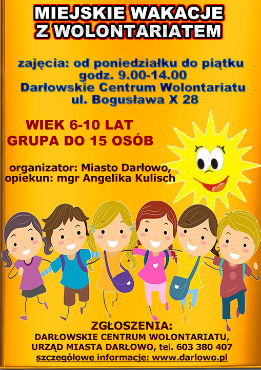 Wielkimi krokami zbliżają letnie wakacje. To czas odpoczynku i zabawy, który warto przeznaczyć na rozwijanie umiejętności i zainteresowań. Z różnych powodów dzieci w Darłowie pozostają w mieście na czas wakacji. To właśnie do nich skierowany jest projekt „Miejskie Wakacje z Wolontariatem" Jest to alternatywa dla komputera, nudy i samotności. Głównym celem spotkań jest rozwój artystyczny dzieci, pobudzenie ich kreatywności oraz pokazanie szeregu możliwości na aktywne i przyjemne spędzenie wakacyjnego czasu.