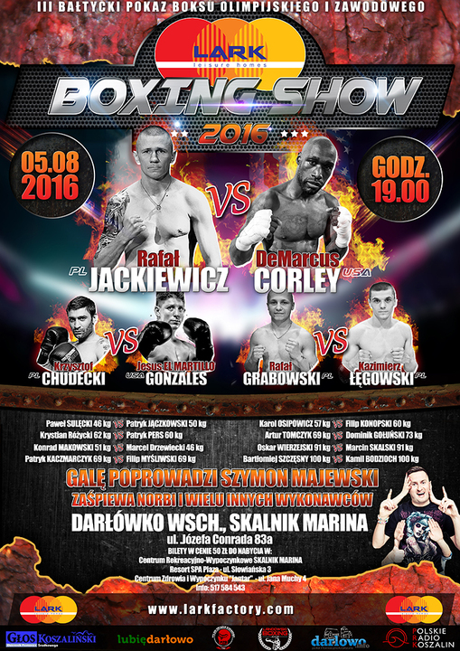 Lark Leisure Homes zaprasza na III Bałtycki Pokaz Boksu Olimpijskiego i Zawodowego, który odbędzie się 5 sierpnia br., w Skalnik Marina, w Darłówku Wschodnim przy ul. Conrada 83a. Pokaz rozpocznie się o godzinie 19:00. W programie: walki bokserskie, występ Norbiego a całość poprowadzi - Szymon Majewski. Bilety w cenie 50 zł do nabycia w: Resort SPA Plaza (ul. Słowiańska 3), Jantar - (ul. Muchy 4) i w Skalnik Marina (ul. Conrada 83a). Walka wieczoru - Rafał Jackiewicz (PL) vs DeMarcus Corley (USA).