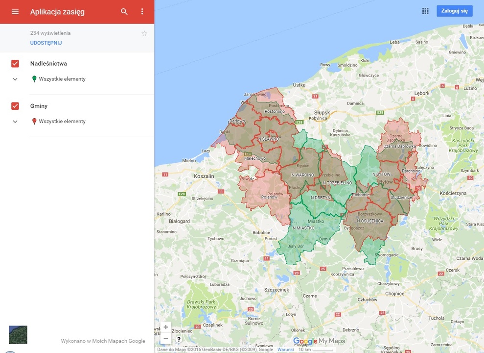 Nadleśnictwa: Trzebielino, Dretyń, Miastko, Warcino, Osusznica, Sławno, Bytów