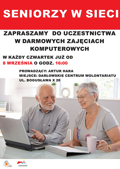 Darłowskie Centrum Wolontariatu zaprasza wszystkich zainteresowanych do uczestnictwa w darmowych zajęciach komputerowych, które odbywać się będą w każdy czwartek o godzinie 16:00 w siedzibie Darłowskiego Centrum Wolontariatu, począwszy od czwartku 8 września. Zajęcia poprowadzi Artur Hara. Polecamy uwadze i zapraszamy. Seniorzy w sieci ... już od 8 września.