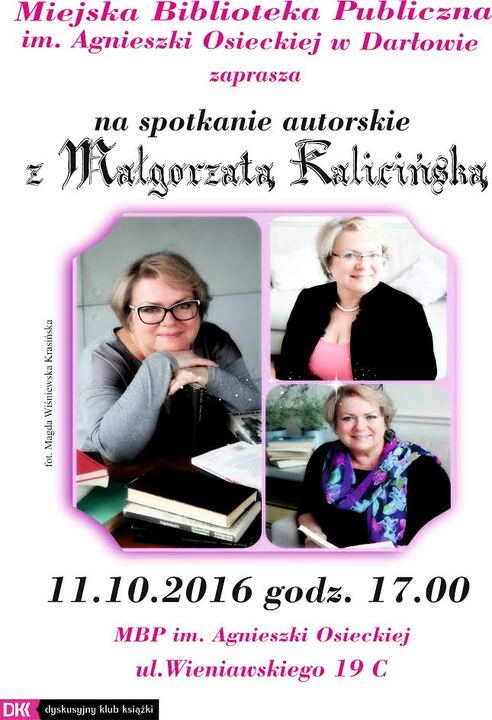 Już w najbliższy wtorek, tj.11 października o godz.17.00 Miejska Biblioteka Publiczna im. Agnieszki Osieckiej w Darłowie zaprasza na spotkanie autorskie z Małgorzatą Kalicińską, autorką książek Miłość nad rozlewiskiem, Powrót nad rozlewisko, Fiołki na trzepaku i wielu innych fascynujących pozycji. Wstęp na spotkanie jest wolny i organizowany w ramach Dyskusyjnego Klubu Książki. Wszystkich zainteresowanych serdecznie zapraszamy.BPM