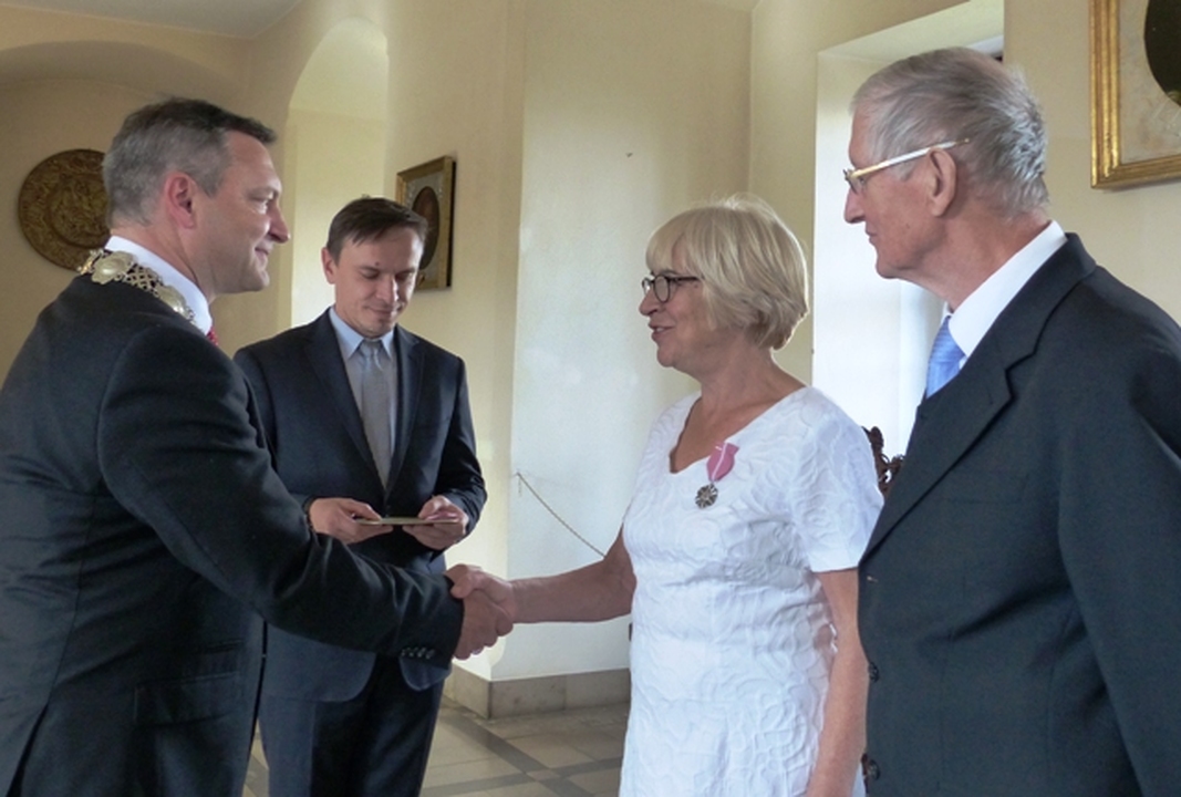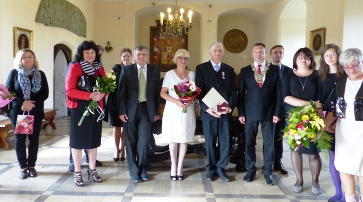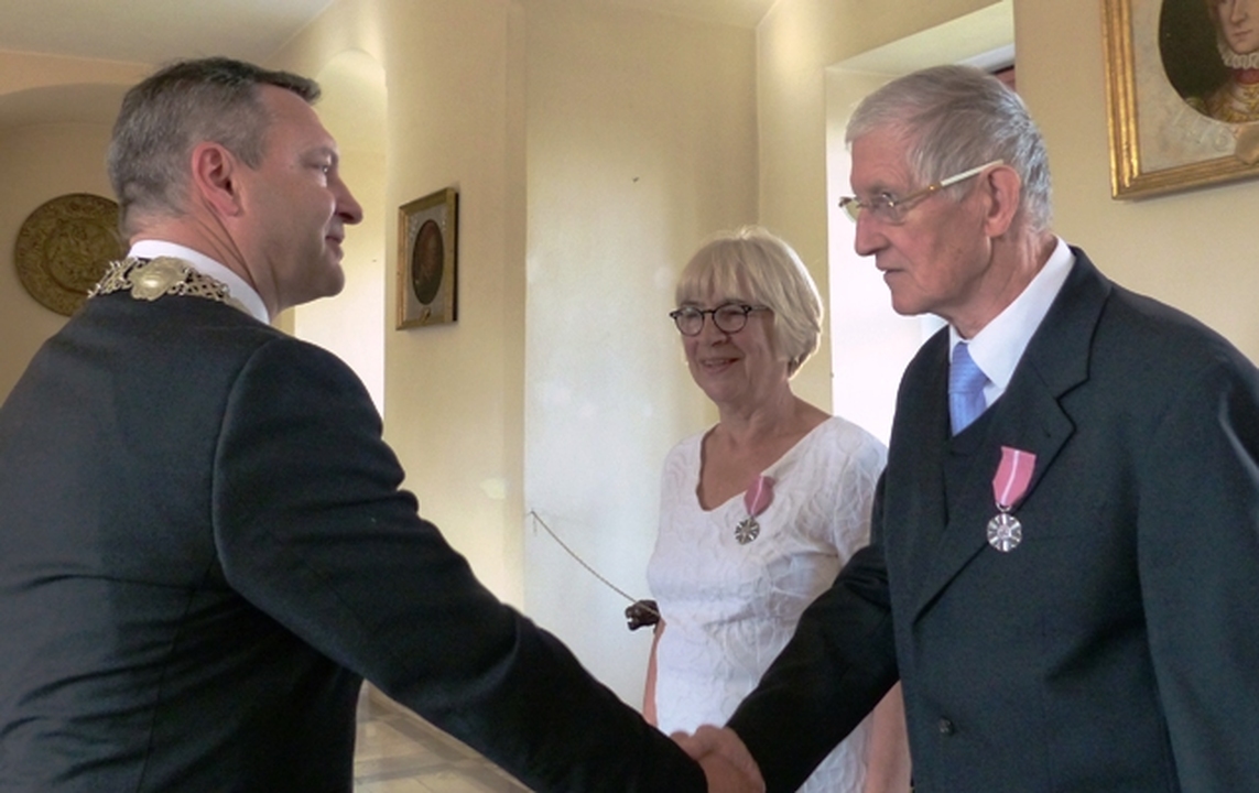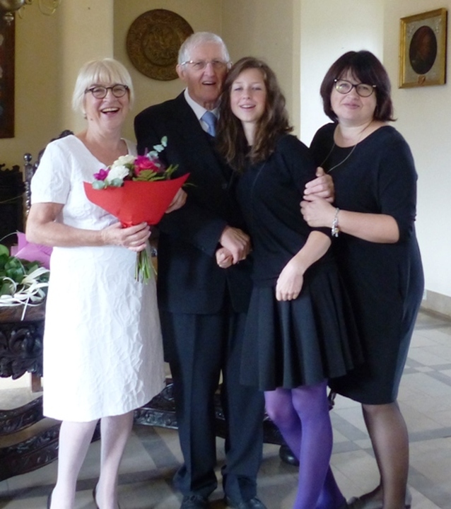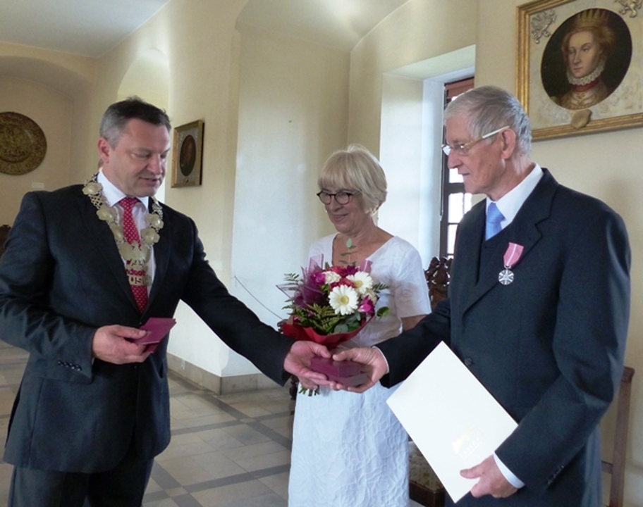 W Zamku Książąt Pomorskich w Darłowie 8 października 2016 Starosta Sławieński Wojciech Wiśniowski w asyście sekretarza Urzędu Miejskiego w Darłowie Krzysztofa  Walkowa uroczyście wręczył  Medale za Długoletnie Pożycie Małżeńskie  nadane przez Prezydenta RP Krystynie i Zbigniewowi Różańskim obchodzących Złote Gody.                                              Z rozmowy z Krystyną Różańską Rok 2016 to czas niezwykłych wydarzeń w mojej rodzinie. Obchodzimy 75. rocznicę urodzin mojego męża i 70. moją,  a także wnuczek: 15. Zuzanny i 18. Weroniki, wreszcie pod koniec roku spodziewamy się trzeciej , 10. Studenta- drugiego już jamnika o tym imieniu, no i „Złote Gody”. Szkoda, że moi rodzice nie doczekali tego jubileuszu. Rodzice przeżyli z sobą od ślubu w roku 1945 w Ostrowi Mazowieckiej  67 lat i to im wiele zawdzięczam. Brakuje ich. Pięćdziesiąt lat temu w ciepłą słoneczna sobotę 8 października 1966 panna Krystyna  Socha i kawaler Zbigniew Różański w darłowskim Urzędzie Stanu Cywilnego  złożyli przysięgę małżeńską. Odebrała ją kierowniczka USC Zofia Berkan. Z Urzędu Miasta nowożeńcy przeszli do Kościoła Mariackiego, ku ich zaskoczeniu  wypełnionego po brzegi, a miał to być cichy ślub.  Wcześniej w sali USC czekała cała klasa panny młodej, wszyscy uczniowie w białych marynarskich kołnierzach, z rodzicami, kwiatami. Świadkami byli Mieczysław Stępniak i Waldemar Paszkiewicz. Jest dla mnie to ktoś ważny.  Mój mąż- Zbigniew Różański urodził się w roku 1941 w Gnieźnie  i metrykę urodzenia wypisano mu po niemiecku. Jego rodzina  z dziada pradziada to Wielkopolanie, zamieszkujący w Gnieźnie i w Poznaniu. Mój mąż czuje się Pomorzaninem, od ponad pół wieku jest darłowianinem. Po podstawówce zdał egzamin do Państwowej Szkoły Morskiej w Gdyni  potocznie zwanej „Szkołą Jungów”. Marzył o morzu i chciał zostać chłopcem okrętowym. Nie został przyjęty bo za mało ważył!  Naukę podjął w szkole zawodowej   w Zakładach H. Cegielskiego w Poznaniu. W 1960 r. Izba Rzemieślnicza w Poznaniu wydała mu świadectwo czeladnicze.  Rok później zostaje powołany do  wojska. Po Podoficerskiej Szkole Łączności w Zgorzelcu w październiku 1962 zostaje skierowany  do  Bałtyckiej Brygady WOP w Koszalinie, a stamtąd po miesiącu do Samodzielnej Eskadry Lotnictwa Rozpoznawczego WOP w Wicku Morskim. Jest na etacie lotnym radiotelegrafisty. Lotnicy chodzą w mundurach marynarskich. Zbyszek patroluje  granice PRL tzw. „Litką”,  latając na AN-2. Niektóre z nich są na pływakach  i wodują przy przystani jeziora Wicko. Tam był wędkarzem i grzybiarzem. Zbigniew Różański w 1969 r. zdaje maturę  w Liceum Ogólnokształcącym dla pracujących w Sławnie (nauka odbywała się w Darłowie). Dowódca jednostki odrzuca jego prośbę o zezwolenie na studia cywilne. Studia oficerskie wiązały się z dłuższym rozstaniem z żoną i 1,5 rocznym synem- dlatego nie podjął  takiej decyzji. W grudniu 1970 jednostka zostaje zlikwidowana i żołnierze zawodowi  przenoszą się do  innych jednostek w całym kraju. Zbigniew Różański trafia do Darłówka na etat ratownika na śmigłowcu Mi-2 . W 1986 r. przechodzi na wojskową emeryturę mając stuprocentowa wysługę. W czasie służby otrzymuje medale za zasługi dla obronności kraju, ale najbardziej ceni sobie medal  „Zasłużony dla Ziemi Koszalińskiej”. W czasie służby był oddelegowany na budowę basenu pływackiego na terenie jednostki w Darłówku, jako ten uczciwy człowiek. W darłowskim oddziale PTTK kończy kurs przewodnika  po regionie. Na emeryturze pracuje jako bibliotekarz  w J.W. w Dąbkach, w sezonie w domach wczasowych, później prowadzi  sklepik szkolny i jest ulubionym  „szefem gimnazjalistów”, zagospodarowuje również działkę ogrodową. W domu potrafi zrobić prawie wszystko –chwali żona. Nie lubi bezczynności. Poznaliśmy się w marcu 1966, wcześniej ciągle stawał mi na drodze… Czym mnie ujął?. To była fascynacja mężczyzną. Jego urodą fizyczną i duchową. Gdy szedł to jakby fruwał. Pierwszy raz w życiu spotkałam mężczyznę z taką pamięcią, inteligencją, kulturą, dobrocią. Miał indywidualne  spojrzenia na wszystko , niczego nie przyjmował w ciemno. Zawsze mogłam na niego liczyć. Nigdy mnie nie zawiódł. Nie ograniczał też mojej wolności, nie zamykał mnie w kuchni i pokoju dziecięcym. Szanował swoich teściów i był dla nich troskliwy. Moja teściowa mówiła, że z całej trójki  to jej najlepszy syn. Pamiętam, że na powitanie ze swoim ojcem całował go w dłoń. Wyważony, spokojny, opiekuńczy. Za młodu zajmował go jazz. W ciężkich czasach zdobył radio, adapter i magnetofon. Czynnie uprawiał sport:  biegi, piłkę ręczną i koszykówkę. Brał udział w zawodach.  Wnuki odziedziczyły po nim żyłkę sportową. Na wojskowych obozach szkoleniowo – kondycyjnych jeździł na bojerach na mazurskich jeziorach, następnie pochłonęło go narciarstwo i do niedawna szusował z wnukami w Tatrach. Nigdy nie mieliśmy samochodu, ale w piwnicy stoją do dziś rowery całej rodziny. Do pracy,5 km na lotnisko, też jeździł rowerem.                                                                                                       Krystyna Różańska urodziła się n w 1946 r., jako pierwsze polskie dziecko  w powojennym Polanowie. Jesienią 1949  rodzice –Weronika i Ryszard Sochowie  przenieśli się do Ruska, a 20 maja 1950 zameldowali się w Darłowie. Dom rodzinny  przy ul. Cichej- pozostał jak mówi już tylko w pamięci, ale do dziś jest jej całym jestestwem, bogactwem, wszystkim! To dzieciństwo, młodość, Rodzice. Nawet gdy były możliwości  zamieszkania poza 