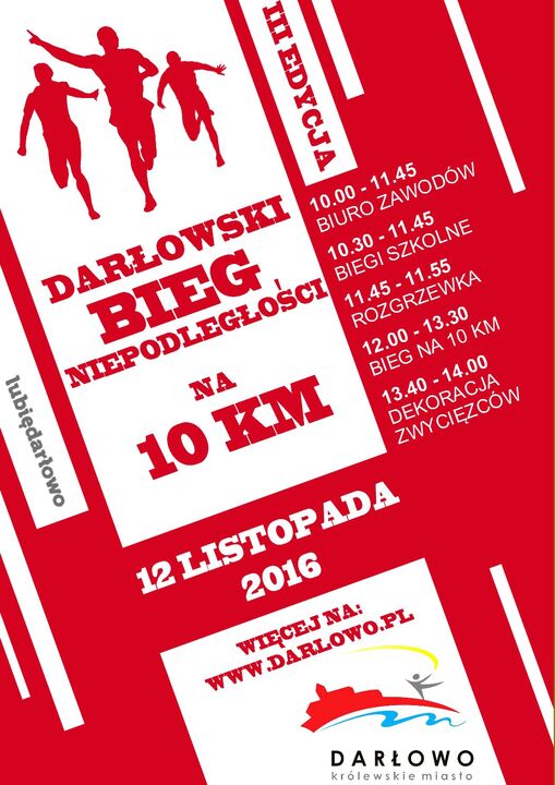 W dniu 12 listopada 2016 r. w sobotę o godz. 12.00 odbędzie się III Darłowski Bieg Niepodległości. Trasa liczyć będzie 10 km i w odróżnieniu do roku ubiegłego prowadzić będzie po uliczkach w centrum Miasta Darłowo. Zawodnicy pięć razy pokonywać będą 2 km rundę. Biuro zawodów w sali konferencyjnej Urzędu Miejskiego w Darłowie.