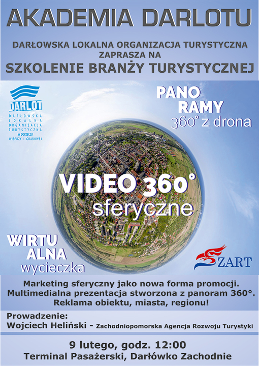 Darłowska Lokalna Organizacja Turystyczna (DARLOT) w ramach Akademii DARLOTU zaprasza na kolejne szkolenie. Tym razem dowiemy się co to jest marketing sferyczny, jak powstaje prezentacja multimedialna z panoram 360 i jak nasz obiekt może dołączyć do wirtualnego spaceru po mieście, miejscu ciekawym turystycznie i wziąć udział w spójnej, wspólnej kampanii reklamowej miejsca godnego polecenia turyście.